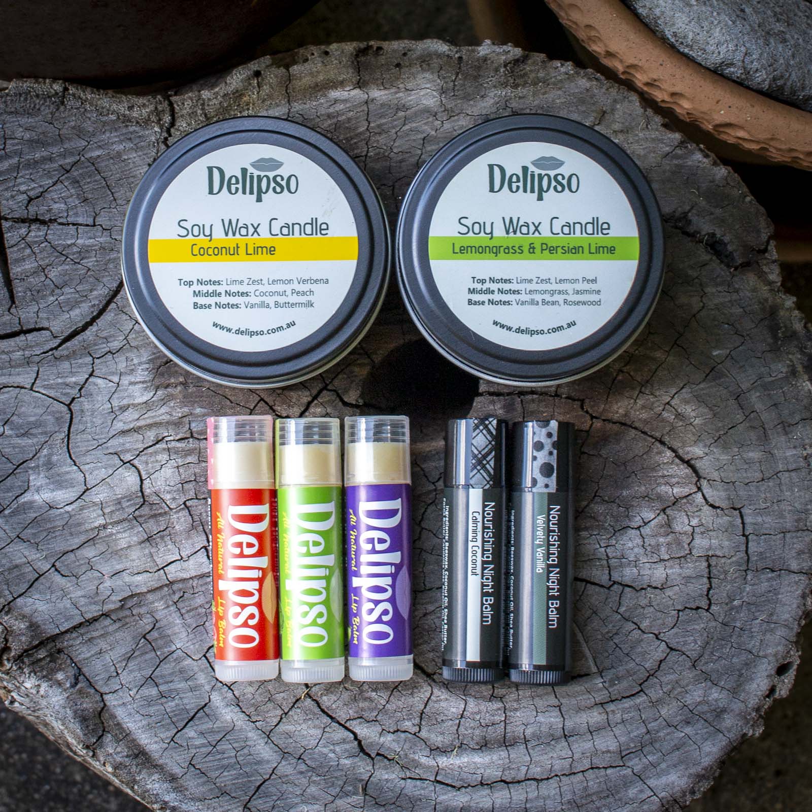 This beautiful bundle combines our deeply hydrating Night Balms, our fun and fruity All Natural Lip Balms, and two of our handcrafted Coconut Soy Candles — creating the perfect pairing for natural self-care, day or night.